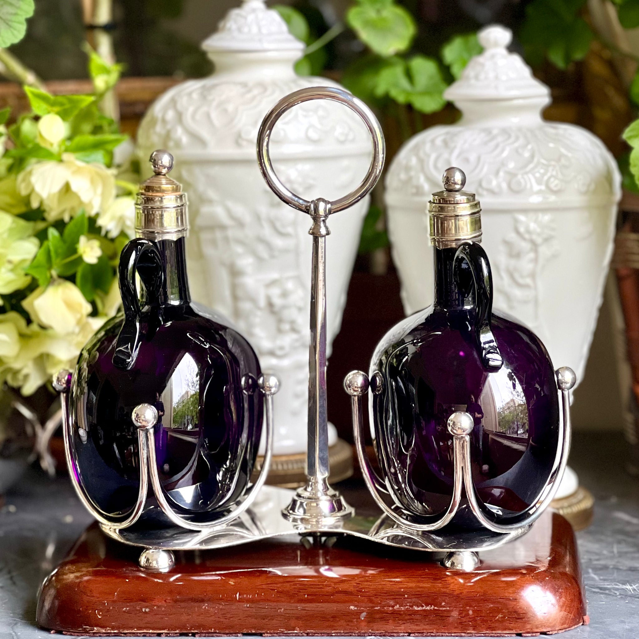 The two amethyst glass flagons with silver plated mounts and stoppers.