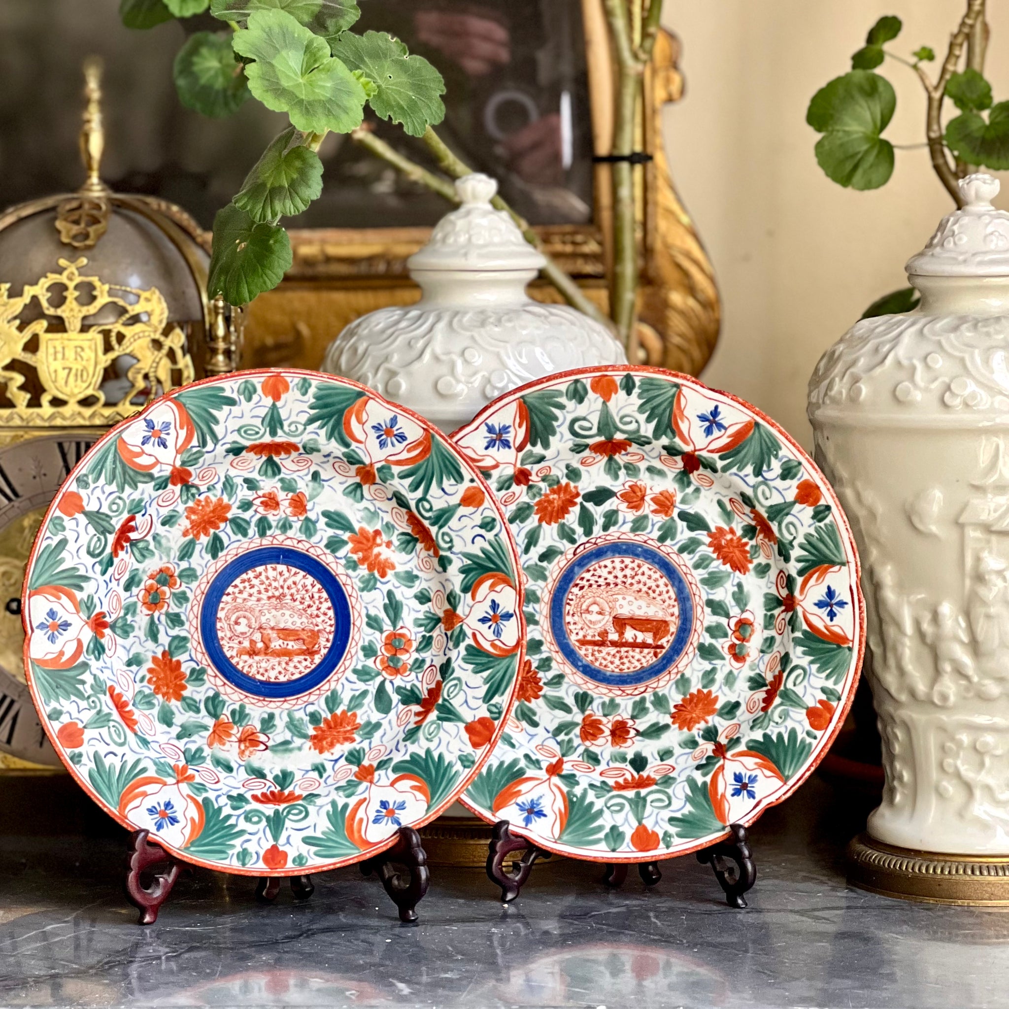 A rare pair of Minton Crazy Cow or Bengal Tiger pattern plates. Painted in dark green, iron red and blue with a stylized Tiger (or Cow)design in the center and with scalloped red rims. Pattern mark no.106 on reverse. Diameter : 22cm English Circa 1798-1805